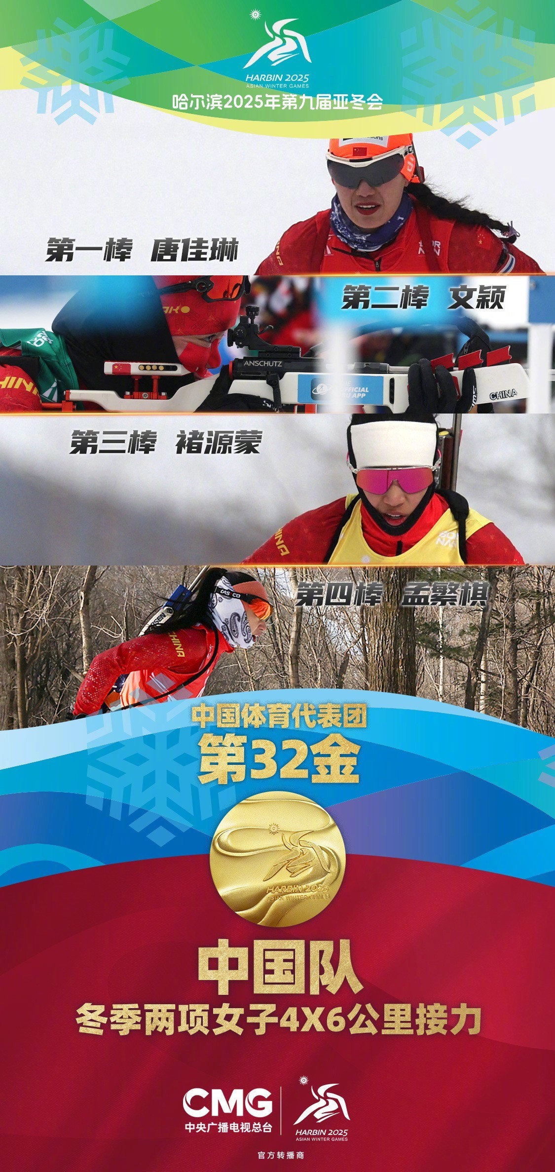 2月13日,哈尔滨亚冬会冬季两项女子4×6公里接力比赛,由唐佳琳、文颖、褚源蒙、孟繁棋组成的中国队夺得金牌。